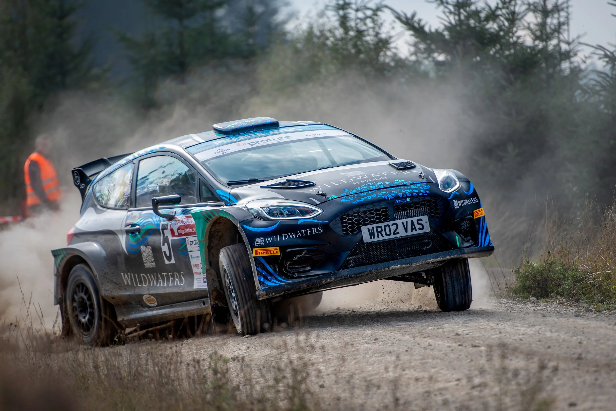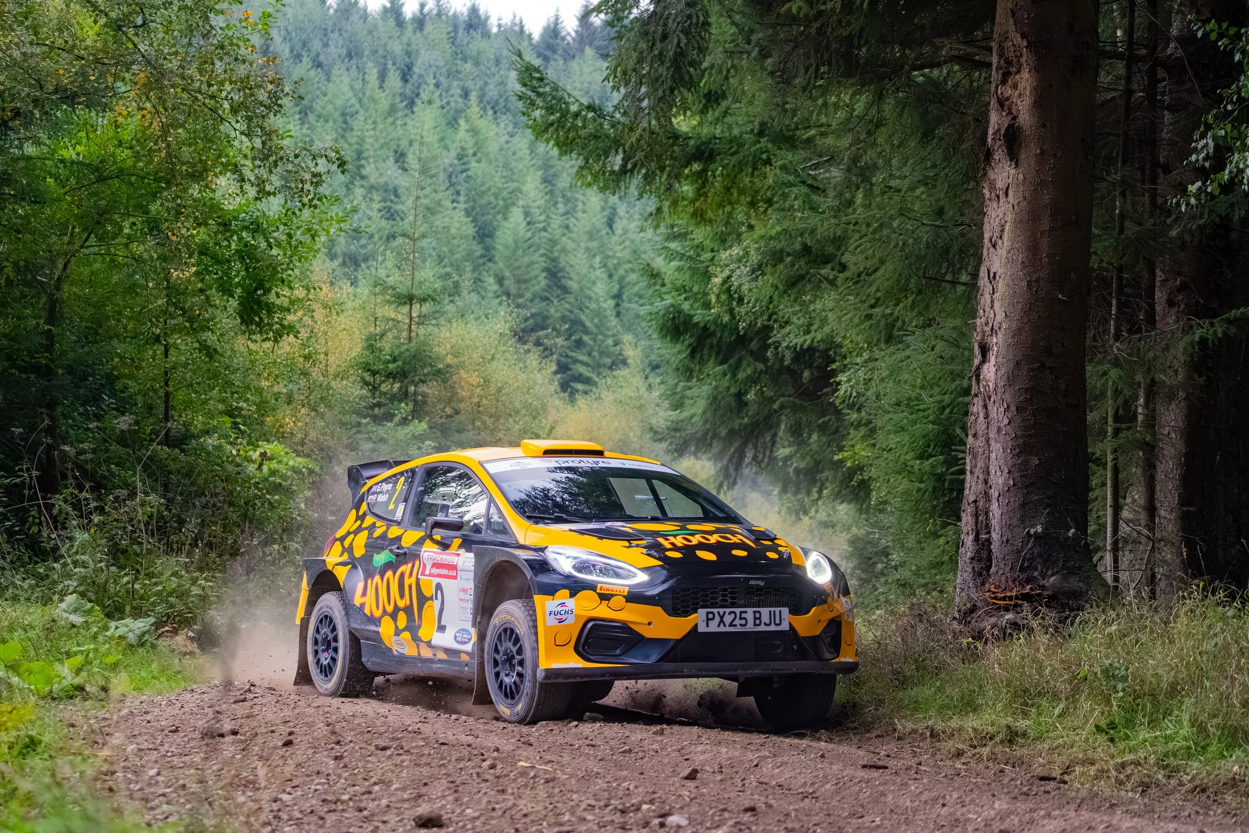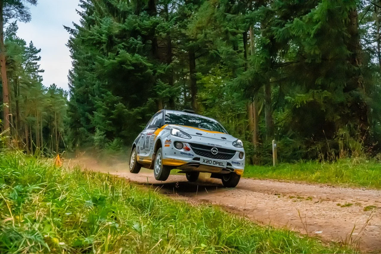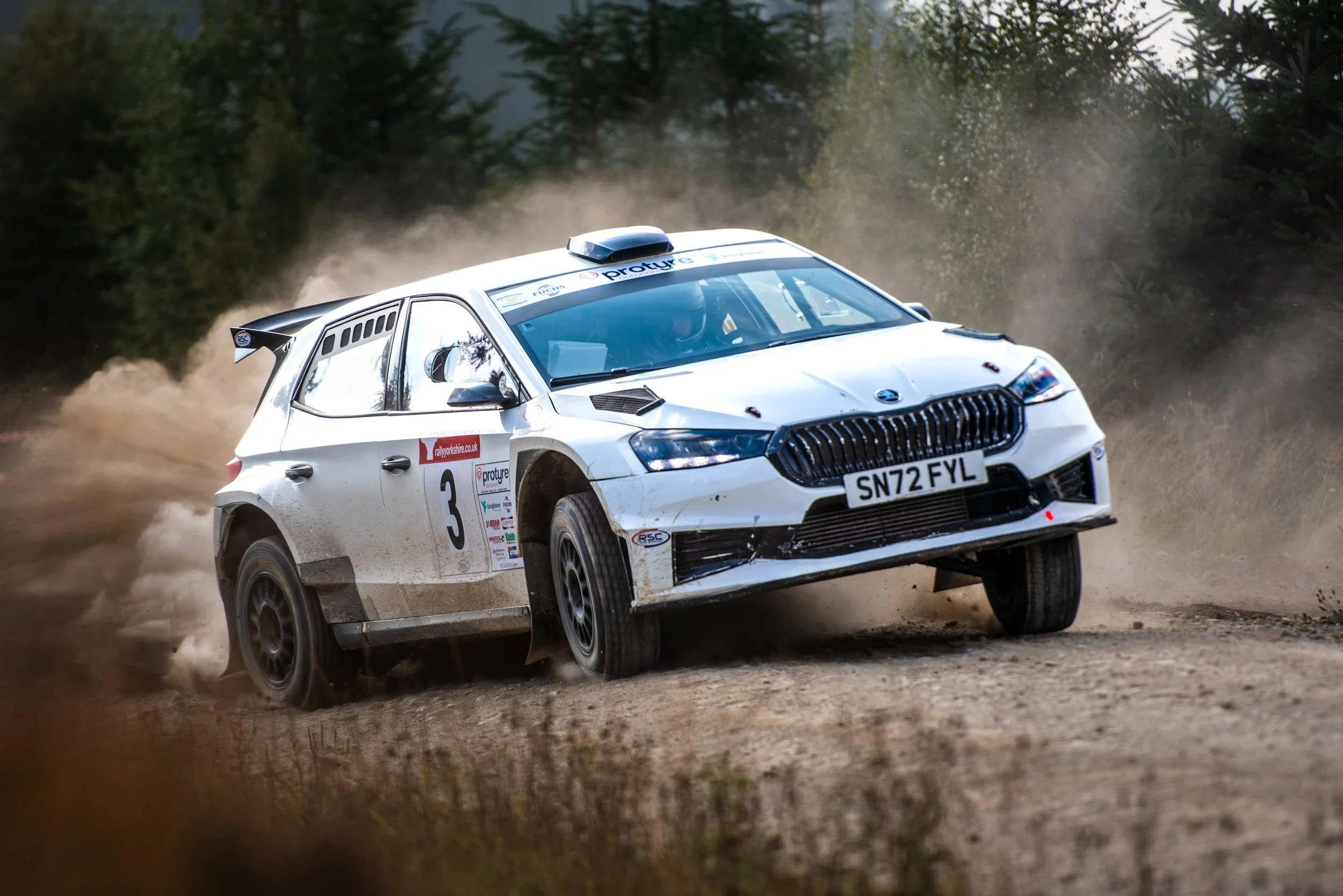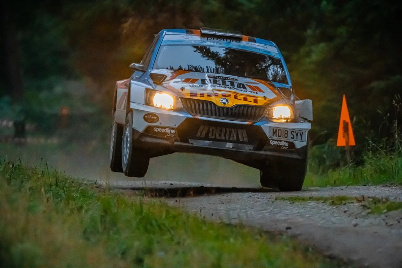 If ever one stage potentially changed the course of this years btrda championship, let alone the rally, it was Dalby. The only running of this stage in daylight this year saw Matthew Hirst’s luck change for the better, in a big way. As Payne’s Firsta entered the Woodyard, smoke was visible from the back of the car. As the Fiesta Rally2 pulled over, the flames started to show externally and although smart fire extinguisher work by Marshall’s saved the car from complete destruction, there was enough damage from the turbo fire to end Payne and co-driver Patrick Walsh’s rally there and then. Thankfully the only harm they suffered was to their championship chances and bank balance. Soon afterwards though Hirst got even luckier… misjudging a cut to a tight right hander round the notorious little “island”, a couple miles further along the stage, the Fabia went up on 2 wheels and tipped onto its side. Again, smart work by Marshall’s restored it to its wheels, with minor damage and they were on their way again in under 30 seconds… and ended the stage in the lead of the rally… Sigurdarson emerged from the mayhem with a fastest time and closed the gap on Hirst to 5 seconds, with York’s Alex Vassallo getting amongst the top times, beating Cunningham, Clark (who disappeared up a deceptive fire break at one point), and Ginley. Behind Hirst, these crews now made up the top 6 overall.